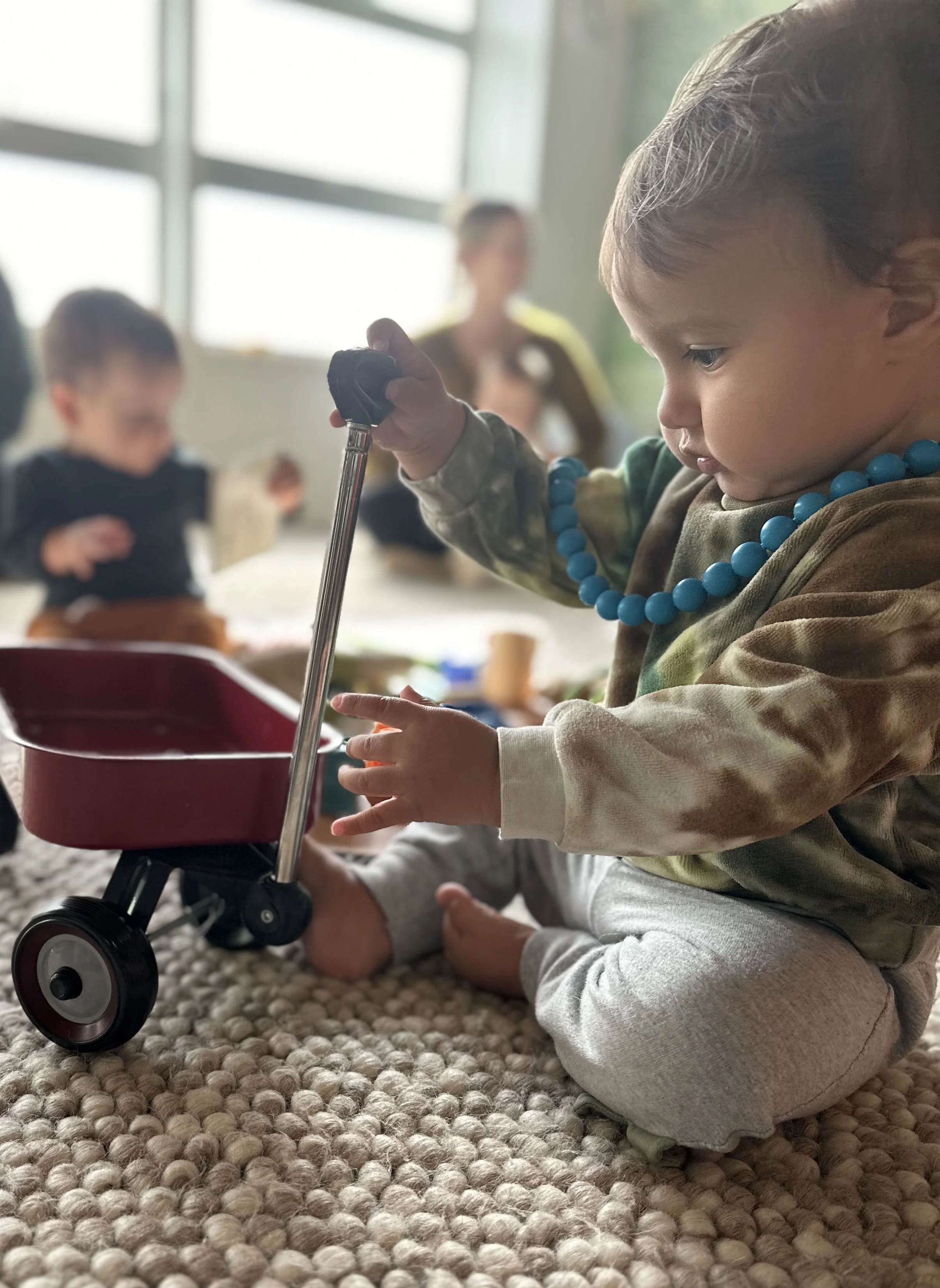 Play Class is a longer format, 90 minute class, offering a warm and playful first step into group experiences. Little ones will be with a teacher in the front space exploring, moving and connecting with peers, developing self-awareness and confidence. Parents will have their own facilitated discussion in a separate space while the children participate in art, music, stories, movement and social time, reuniting with caregivers for songs at the end of the session.
